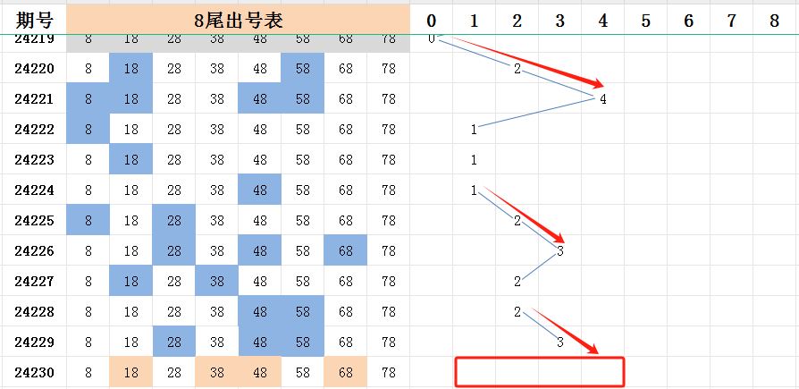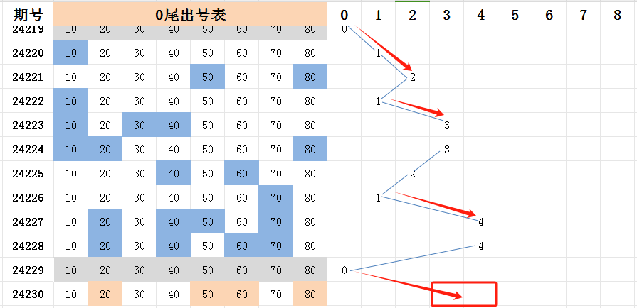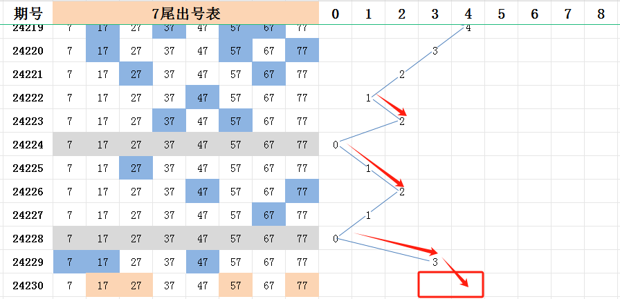 所以,判断近期会出现后半部分的尾号个数大幅度占优的期数。上期前后尾的比例是10:10,连续两期。不过两个开出号码最多的尾号7尾和8尾,均是后半部分的尾号。各开了三码走势。本期看看后半部分能不能开出一个四码或者五码的尾号!