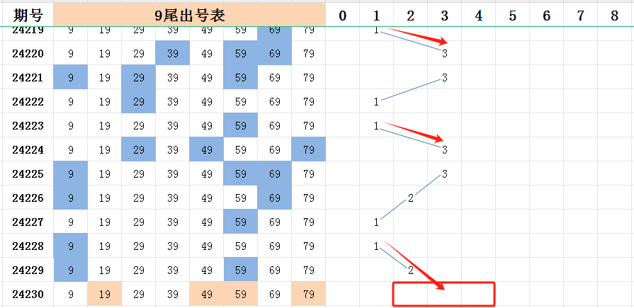 选择九尾的原因,很简单。截至目前,九尾是所有尾号中最热的号码,已开出六次的多码走势(五码及五码以上)。对最热的尾号,应该有应有的尊重。
