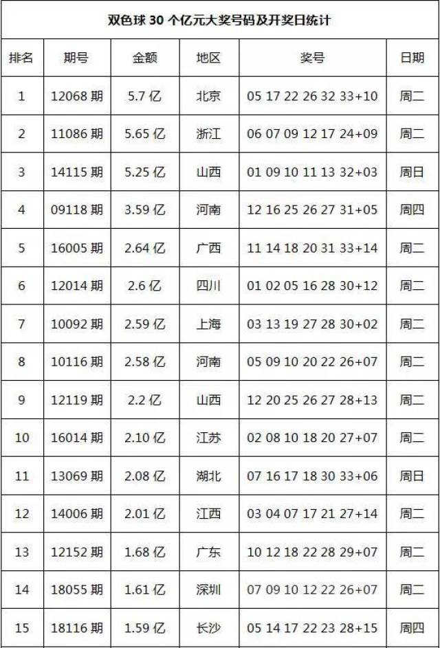 看到上面的统计数据,我们发现在双色球迄今为止的30个亿元巨奖中,有16个是在周二开出,占比超过半数。双色球中奖金额中排名前十里面,更是有八名都诞生于周二,仅仅排名第三以及第四的大奖例外。不得不说,亿元大奖特别青睐周二。
